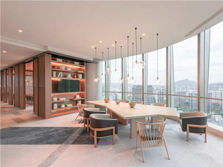 无主灯设计的休闲区删繁就简,于独处与相聚、度假与商务间达到精确的平衡。贝壳意向的吊顶、砗磲纹理的侧墙、竹篮意向的隔断等带有鲜明文化印记的符号,使休闲区在满足功能需求的同时,也与地域文脉、建筑风格、环境氛围相契合。
