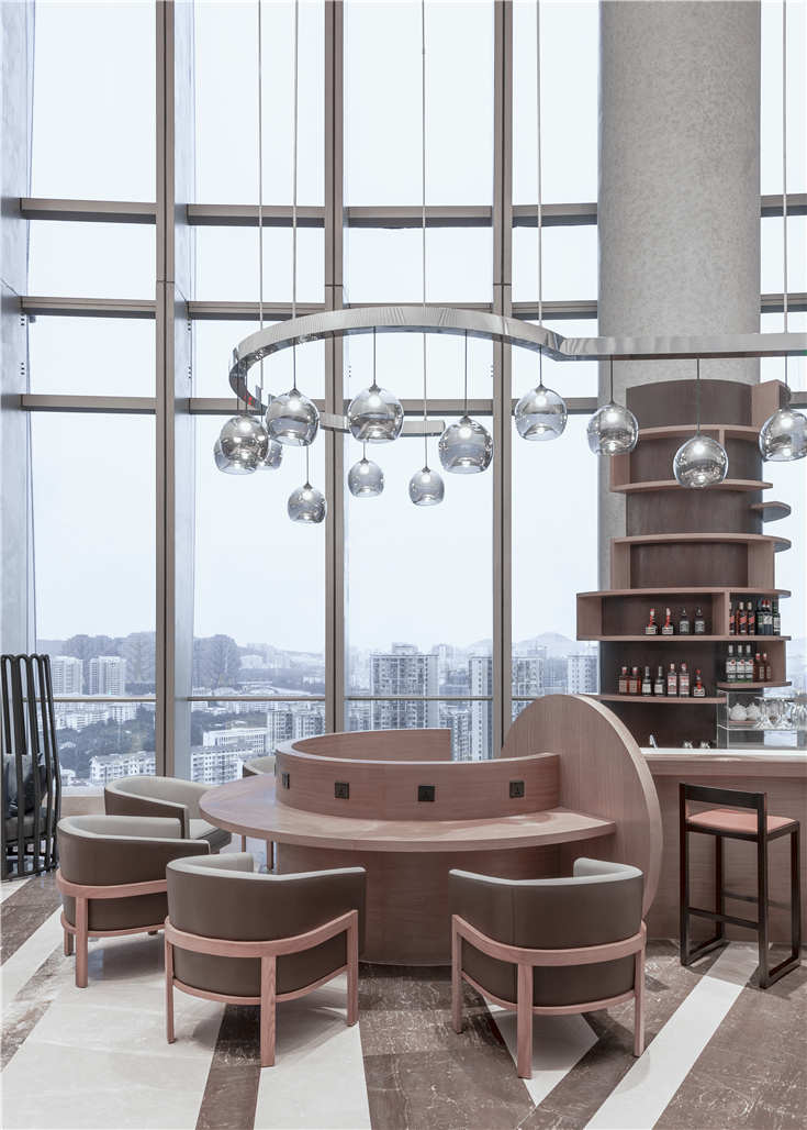 接待大堂承接首层大堂的气质,并寻求新的突破与平衡,以无声,胜有声。木色接待台与深浅交错大理石奠定了时尚商务的基调。环绕电梯厅的四面渐变色艺术夹胶玻璃,波光粼粼地演绎着从大海到沙滩的律动。吧台区与接待台并肩而立,环绕其上的半球型金属吊灯增加了空间变化,并形成有效区隔。罕见的圆弧造型在这里尤显灵动,夜幕下三五好友围合而坐,或小酌浅饮,或闲话当下,才不负三亚度假之名。