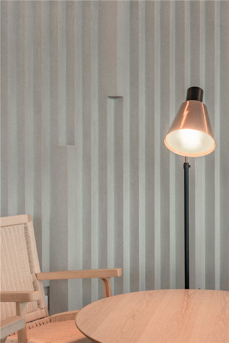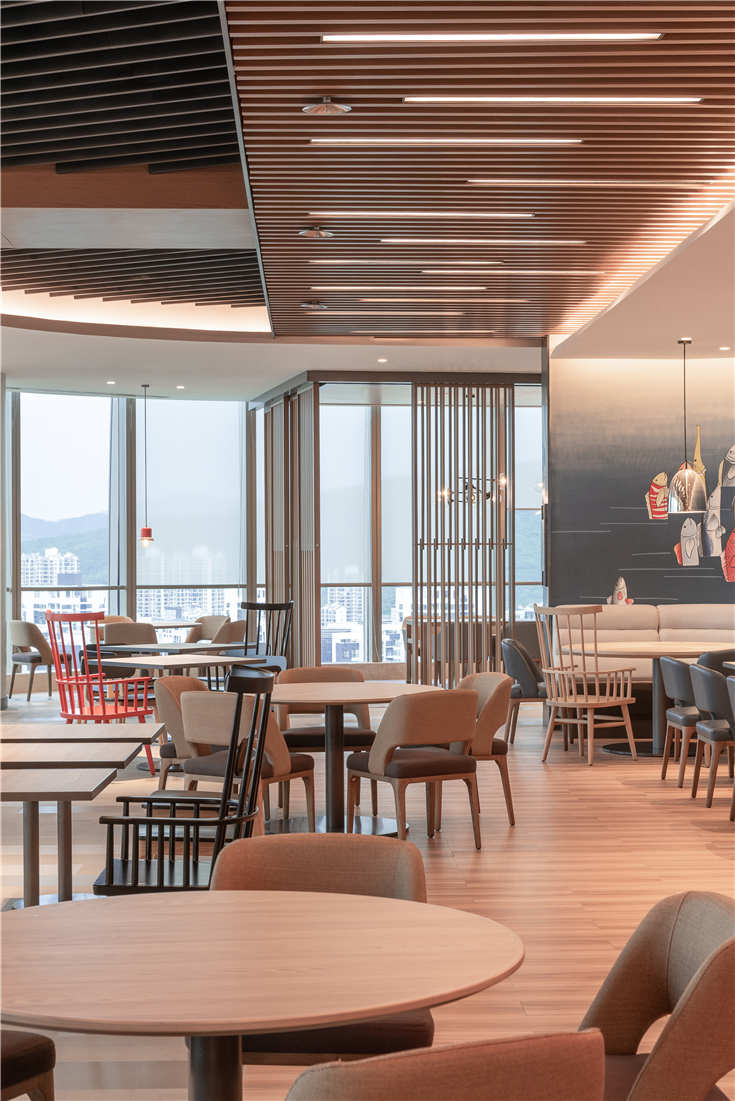 餐厅以时尚轻快的基调彰显出品牌活力。座椅、灯饰、地面材质的多样性消解了餐厅空间形状不规则及面积过大带来的尴尬,亦提供了更自由的选择。开放式的社交体验,自然光无阻碍的渗透,营造出如家般的自在氛围。光面、磨砂、充满肌理感的大理石及各式地毯,以同样的线性设计语言呈放射状铺设,呼应建筑的弧形设计。活泼鲜艳的海洋装饰画打破了空间的宁静,碰撞带来的视觉美感丰富了空间的层次。餐厅包房区以木质格栅围合,既实现空间的界定,又不影响视觉的穿透。一扇扇木质格栅,带着华夏文明的隽秀之气,开合之间,已完成包房到开放式就餐区的功能转换。
