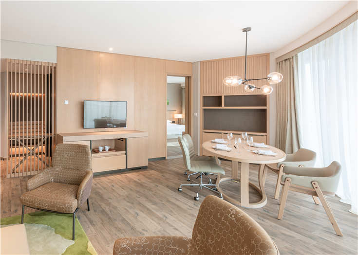 高大通透的天井拉开客房的序幕,木纹铝板与造型玻璃的大面积运用,丰富着空间视觉。客房设计清雅简约,清浅的木色勾勒出整体空间的雅净氛围。绿色装饰画及通过层叠工艺营造出的波浪肌理感的地毯成为空间悦动的音符,与精巧露台外的无敌海景和谐共鸣,带来独属滨海城市的睡眠体验。