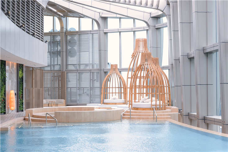 天涯海角之畔、三亚城中之巅。顶层露天泳池将波浪、漩涡等意向具化为大大小小的圆,打破泳池固有的方正呆板形象。源自鱼篓造型的休息区、环绕的绿植、三亚特色洗米石及防腐木的交错铺陈,模糊了室内外边界,让人轻松过渡到大自然中。顶层花园平台可作为举办大型聚会的场所,举目环视,城中风景一览无遗,却又有大隐于市的舒适与静逸。