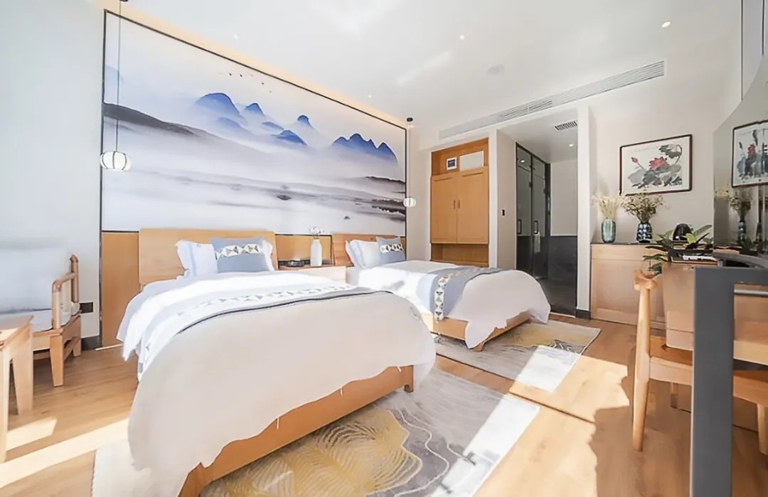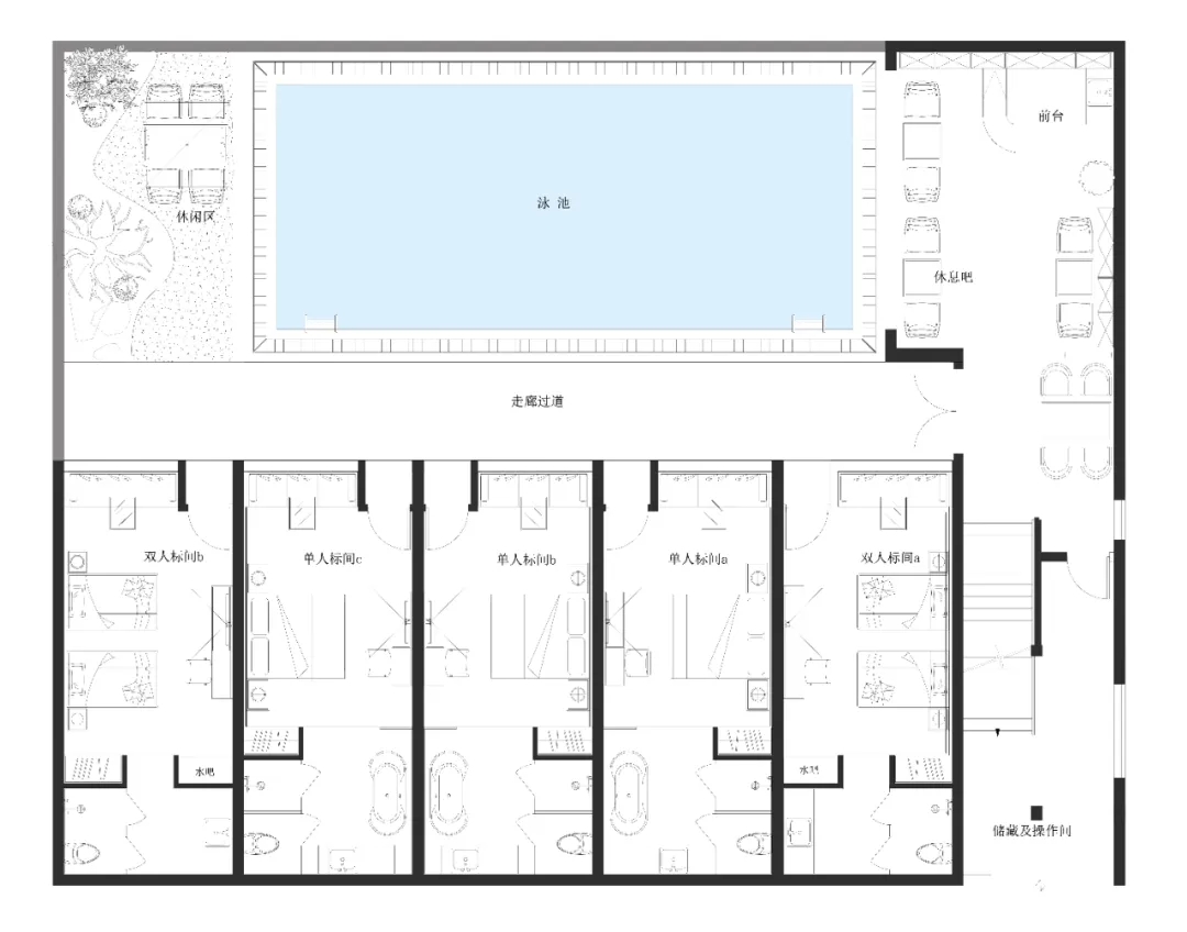建筑空间为一个小四合院,在保持民族特色的同时,设计师更多考虑到旅游者的舒适感和体验感,在有限的庭院中设计了泳池,弥补了游客不能下洱海游泳的遗憾,同时也营造了与其他客栈不同的效果,创造了一种打开房门就可以游泳的豪华体验。
