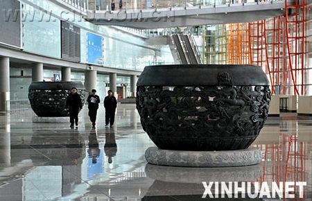 新航站楼的清明上河图、长城万里图巨型屏风和仿浑天仪的《紫微辰恒》雕塑让人品味五千年的中国历史;《门海吉祥》的4口大缸和汉白玉制作的《九龙献瑞》成为标志性景观,以紫禁城太和殿两侧的铜缸和北海的九龙壁为蓝本;在旅客候机区分布着古典园林景观。